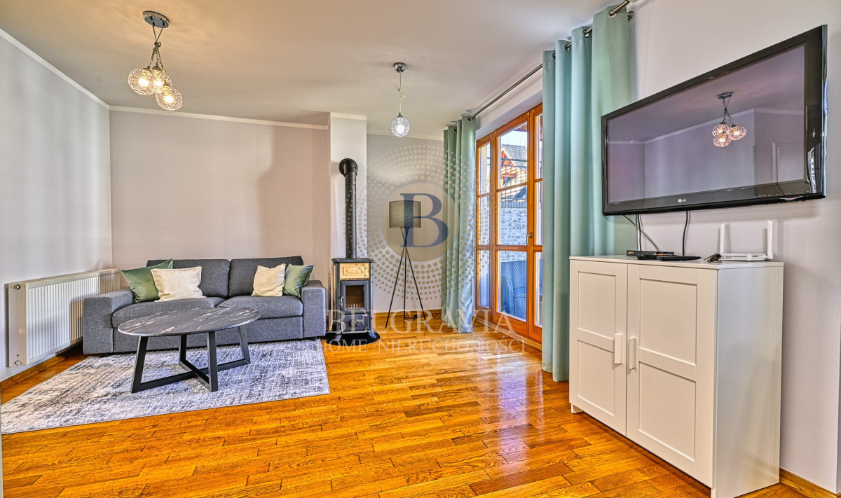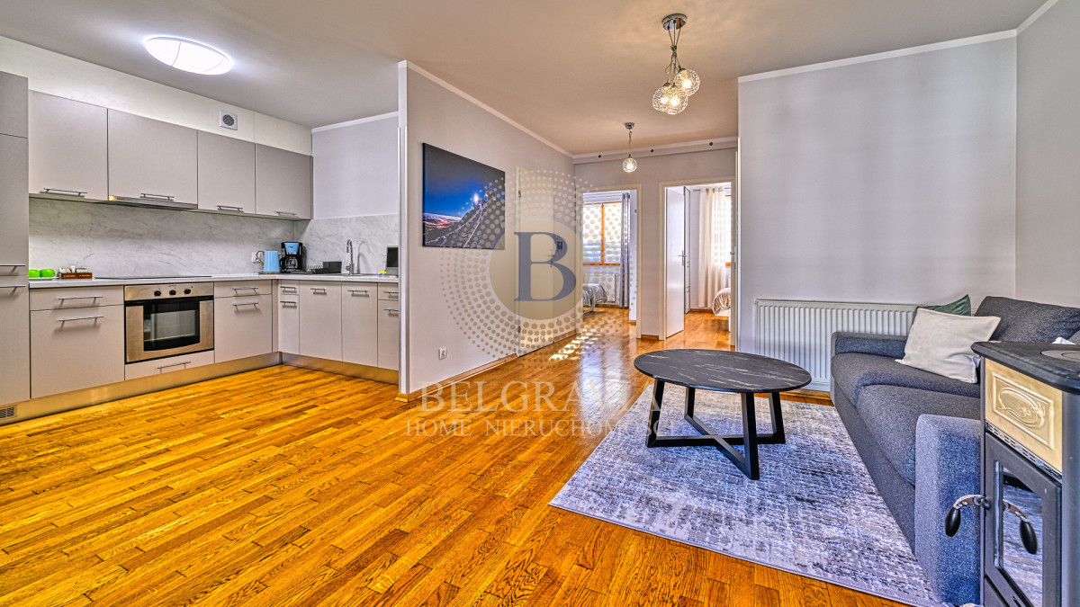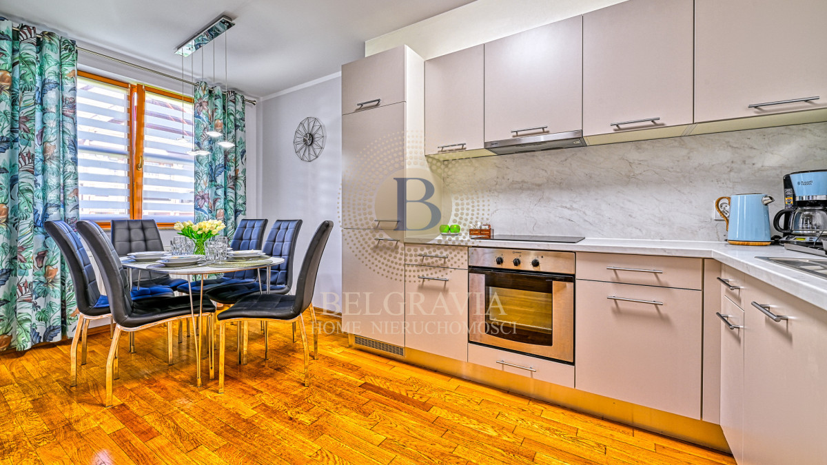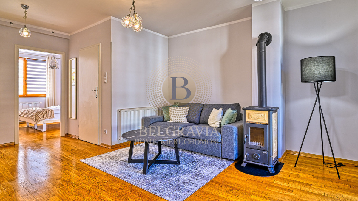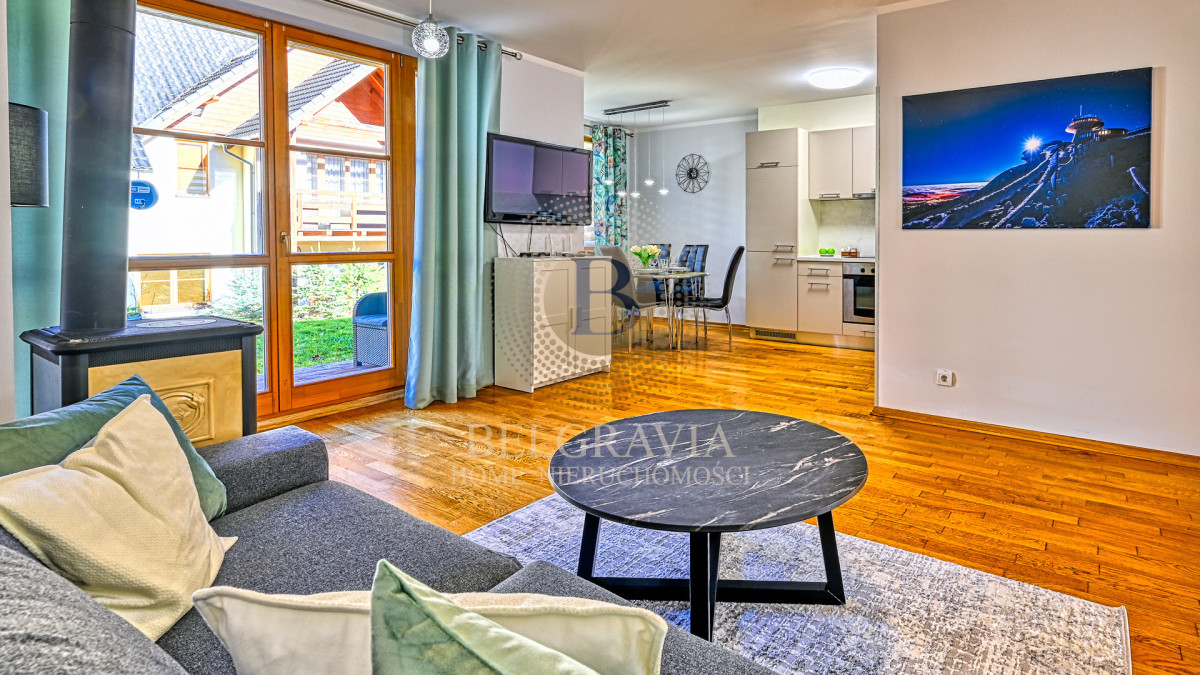 Apartament został zaprojektowany w sposób praktyczny i „gotowy do użytkowania” - to wnętrze, które dobrze sprawdza się zarówno w codziennym korzystaniu, jak i w najmie krótkoterminowym. Strefa dzienna łączy salon z częścią jadalnianą; całość jest jasna, przytulna i spójna stylistycznie. Dodatkowym atutem jest klimatyczny piecyk, który podkreśla górski charakter miejsca.