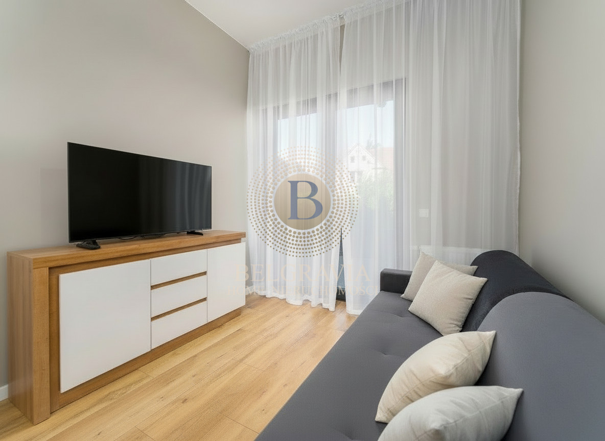 • Apartament jest urządzony w nowoczesnym, wakacyjno‑hotelowym stylu z wyraźnymi nawiązaniami do nadmorskiej lokalizacji. Wnętrze jest jasne, lekkie, uporządkowane, z przewagą bieli i beżu, przełamanych drewnem.