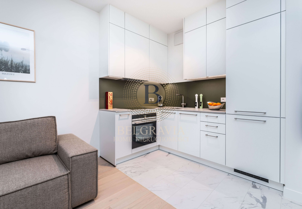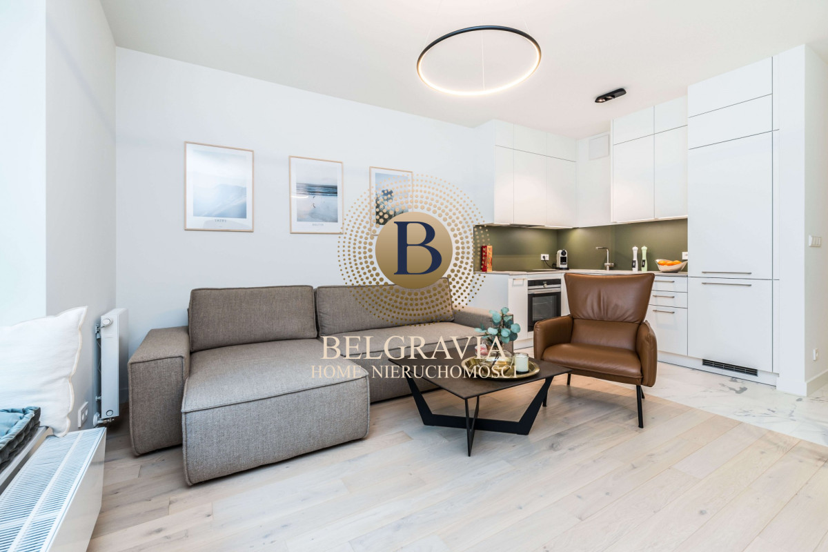 The apartment consists of the following rooms: entrance hall (built-in closet), living room with kitchenette, bedroom (built-in closet) and bathroom. In order to ensure the comfort of residents, the apartment has been equipped with the Fibaro intelligent apartment management system. The apartment building is also equipped with an elevator, monitoring and reception.