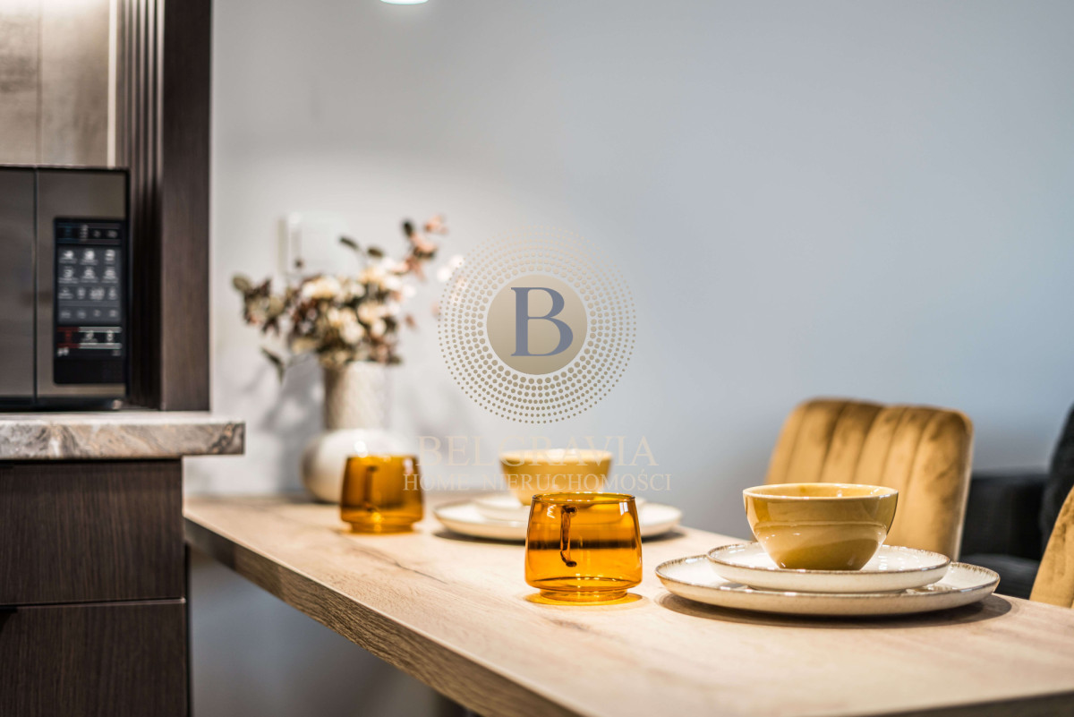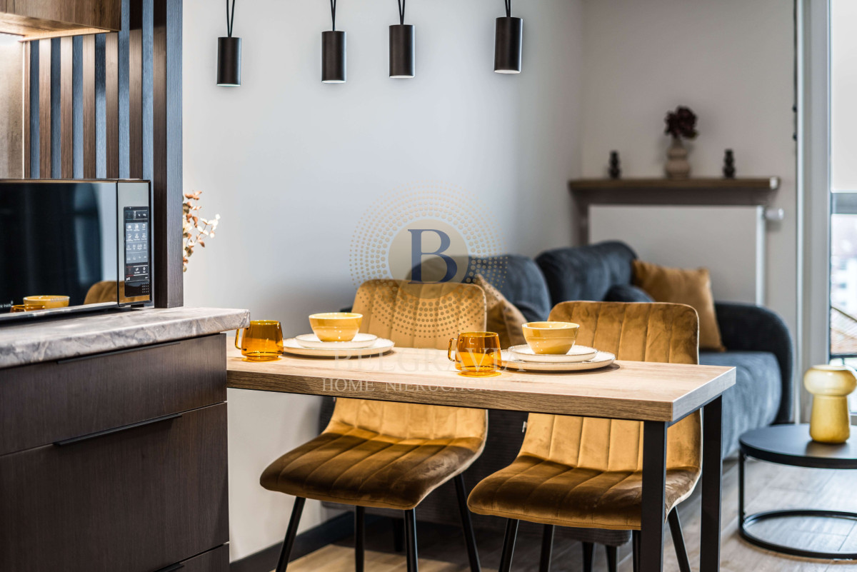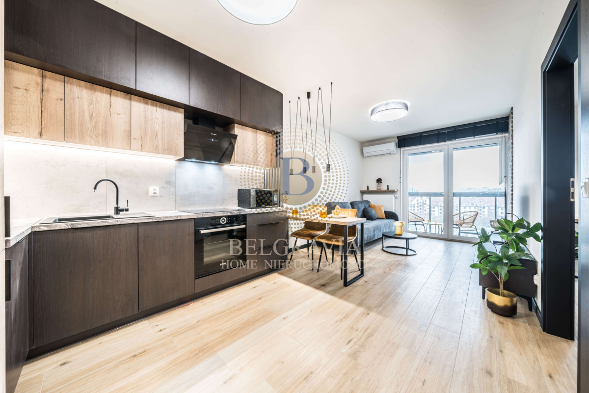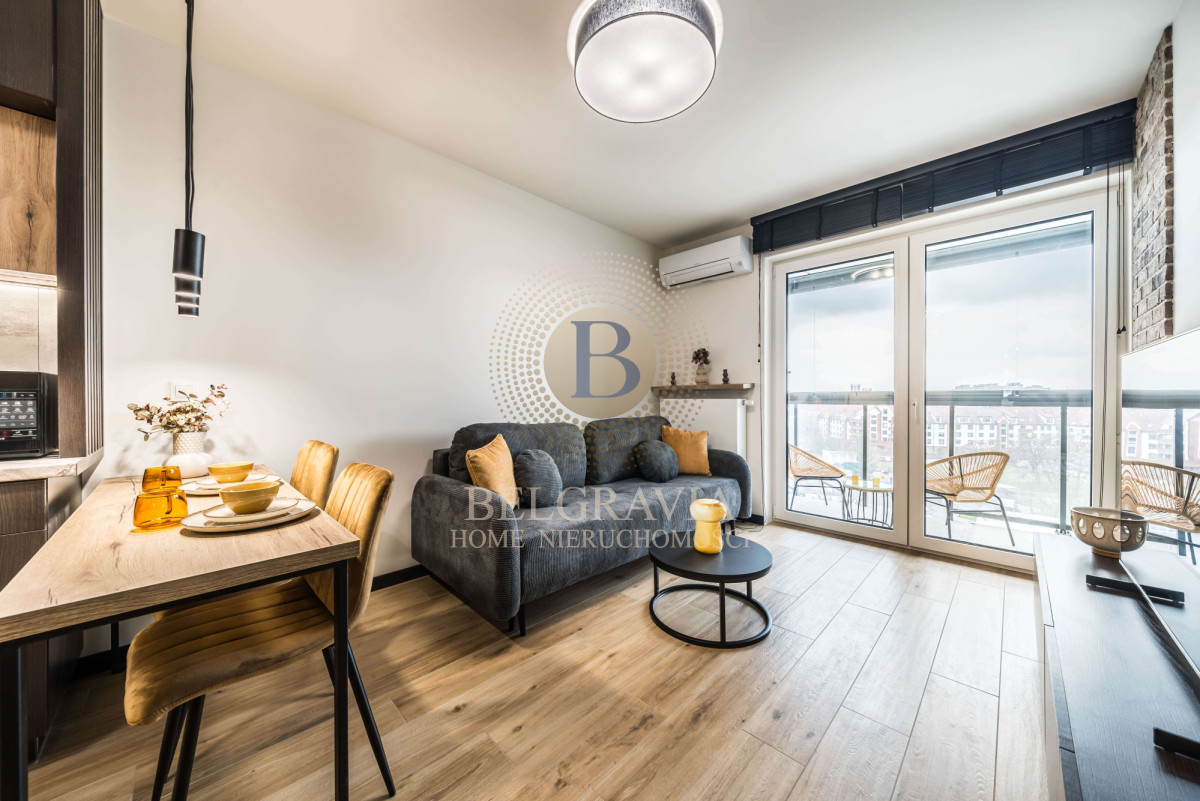Apartament składa się: z salonu połączonego z funkcjonalnym aneksem kuchennym, wyposażonego w sprzęt AGD, sypialni, łazienki z prysznicem, przedpokoju oraz balkonu. Mieszkanie jest w pełni urządzone i dopracowane z dbałością o każdy detal.