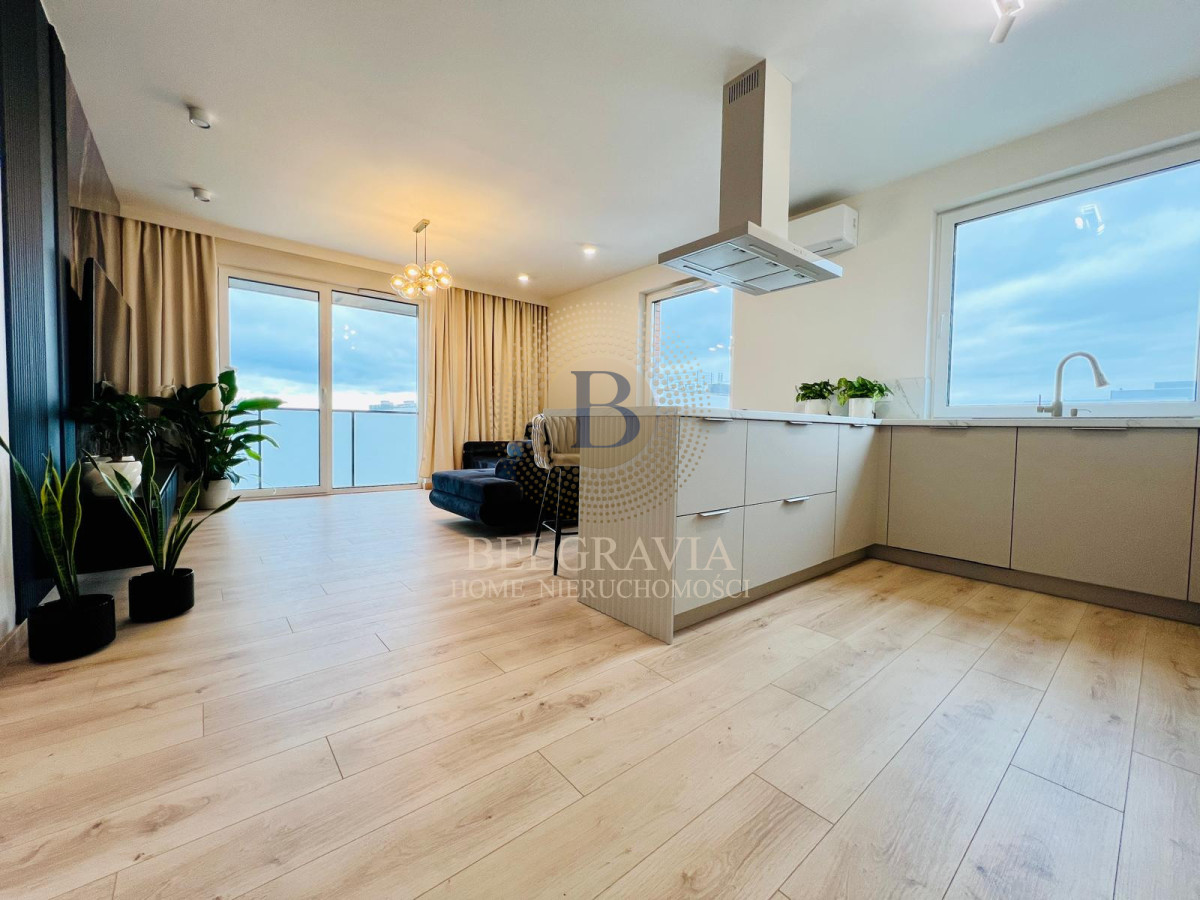 Przestronny salon z rozkładaną sofą z funkcją spania, TV oraz wyjściem na balkon, połączony z aneksem kuchennym wyposażonym w wysokiej klasy sprzęt AGD (zmywarka, piekarnik, płyta indukcyjna, lodówka, okap) oraz wyspą z hokerami,