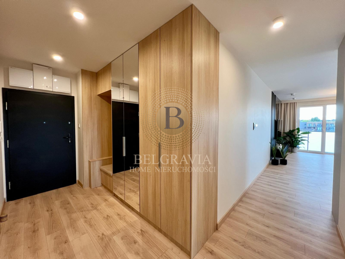 Przestronny przedpokój wyposażono w szafy w zabudowie, co pozwala na utrzymanie porządku i dyskretne przechowywanie rzeczy codziennego użytku.
