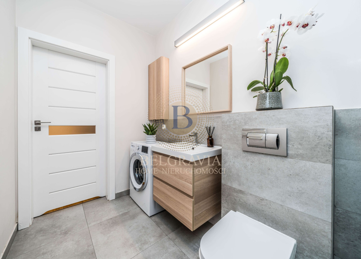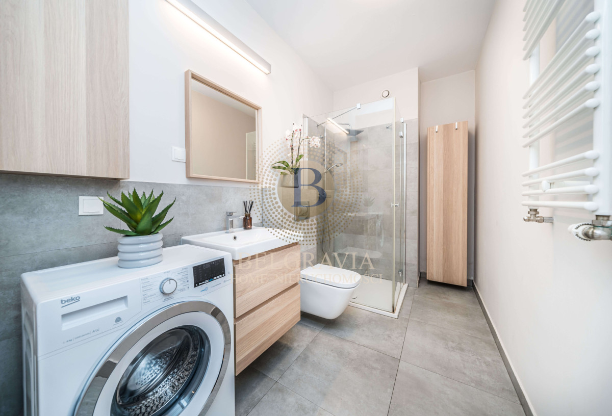 • Łazienki z przestronną kabiną prysznicową typu walk in, zabudowaną umywalką, pralką oraz grzejnikiem łazienkowym