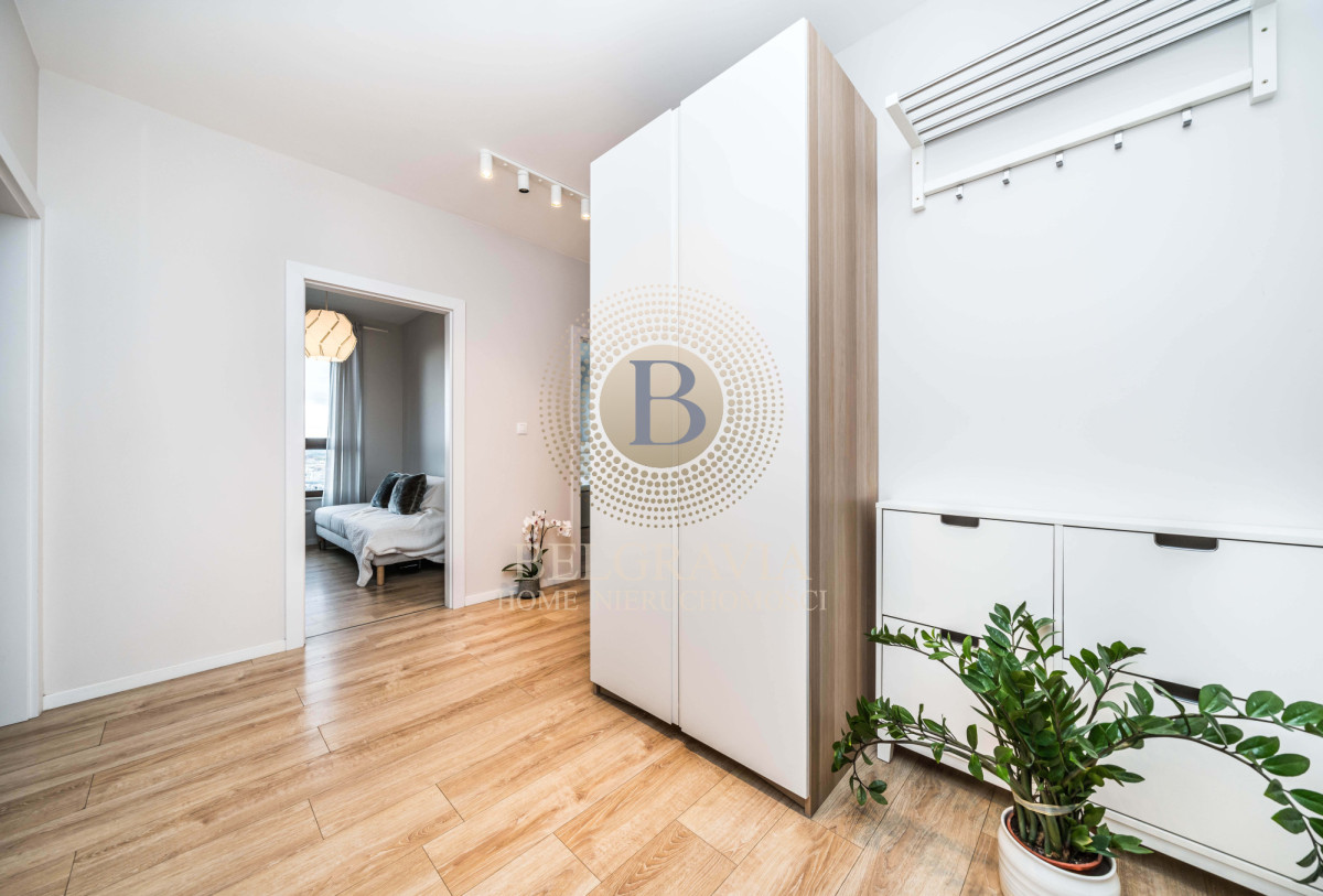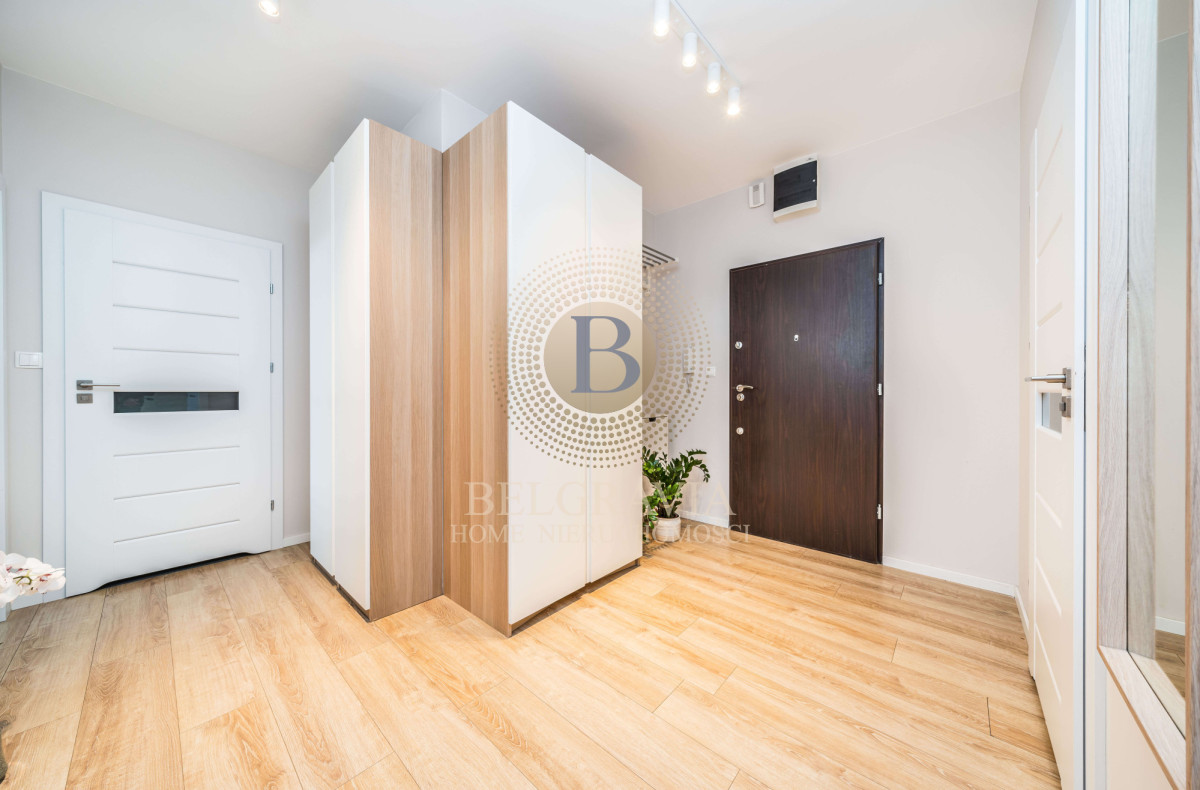 • Przedpokoju wyposażonego w dwie pojemne szafy w zabudowie, wieszak na ubrania oraz lustro