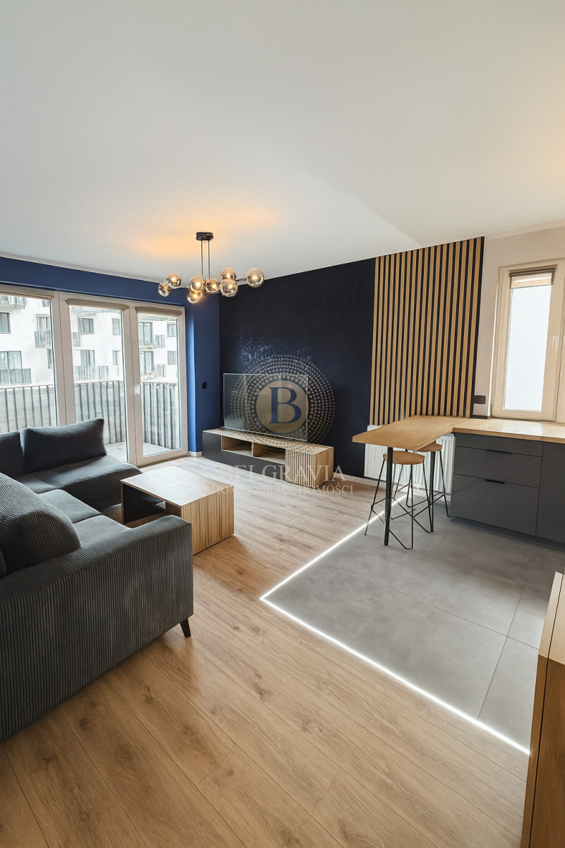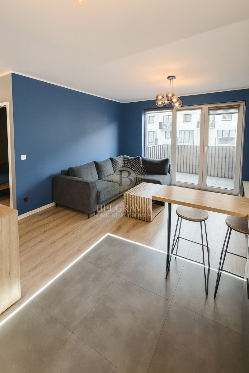 - Salon z aneksem kuchennym, wyposażonym w nowoczesny sprzęt AGD. Przedłużony blat z hokerami tworzy wygodną strefę jadalnianą. W salonie znajduje się komfortowa narożna sofa oraz stolik kawowy. Z salonu wyjdziesz na balkon, gdzie możesz wypić poranną kawę i zaczerpnąć świeżego powietrza.