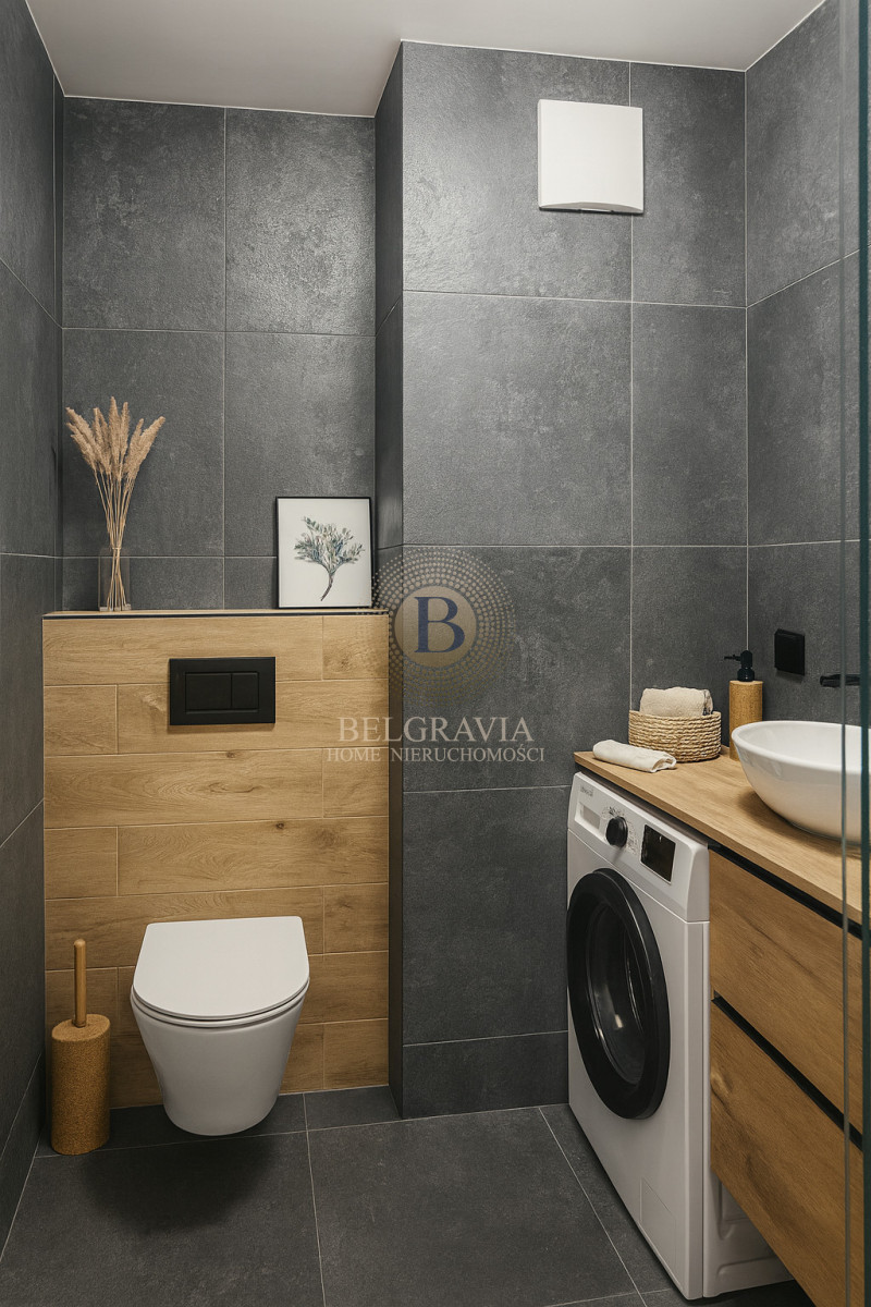 - Łazienka z prysznicem typu walk in, umywalką, pralką oraz grzejnikiem drabinkowym