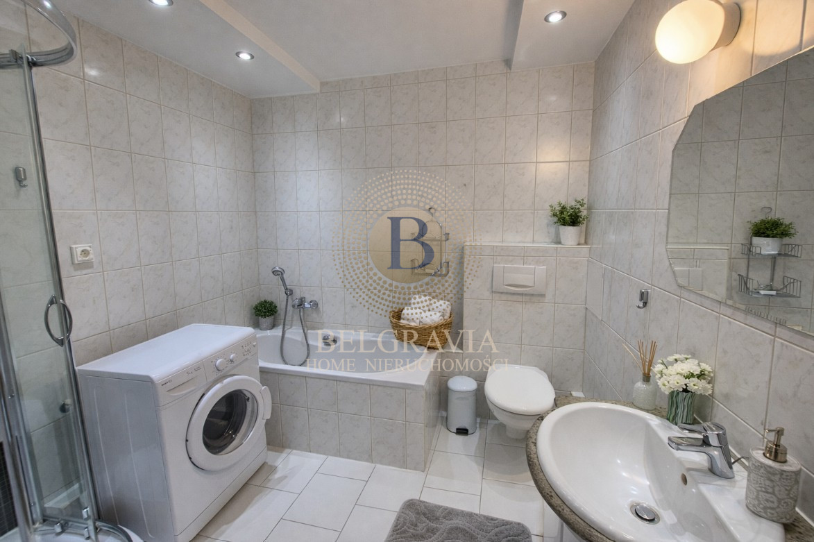 - Łazienki wyposażonej w wanne, kabinę prysznicową, umywalkę oraz pralkę